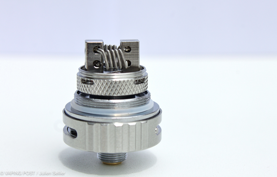 Visually, the change is obvious from the version 3. Its diameter slightly increased from 18 mm to 22 mm. It has an adjustable airflow system located at the bottom. The Pyrex tank is now shock-protected by a stainless steel cover and the drip-tip is much larger and equipped with an airflow. The tank has doubled its liquid capacity and now reaches 5 ml. Not that the latter is rather around 4 ml when using the RBA deck.