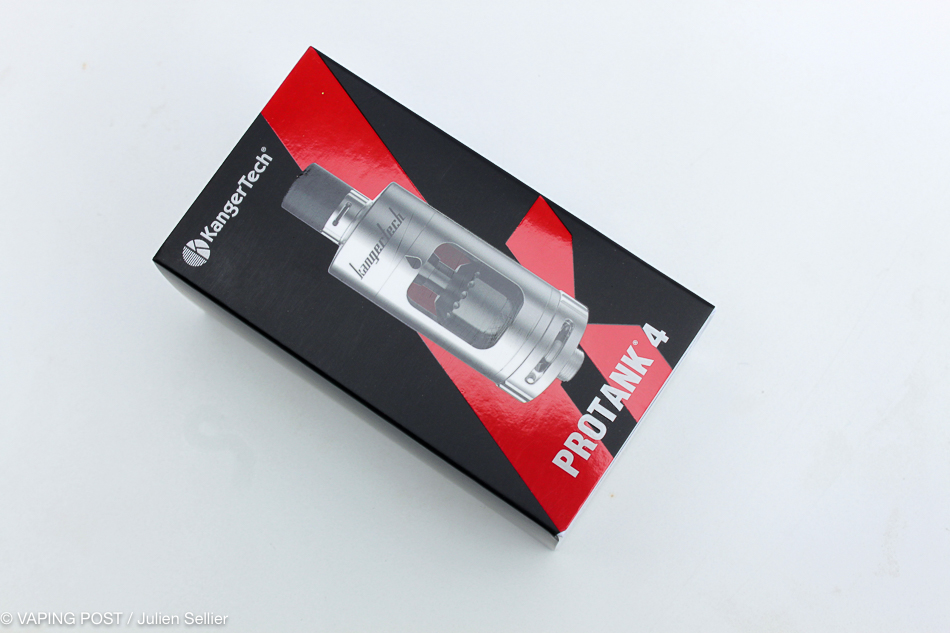 Protank 4 comes in a red and black carton box, the colours of the Shenzen company. Inside, as often with Chinese manufacturers, everything is present. Tank, drip-tip, two disposable heads (one ceramic SSOCC in 0.5 Ω and one MTL in 1.5 Ω).