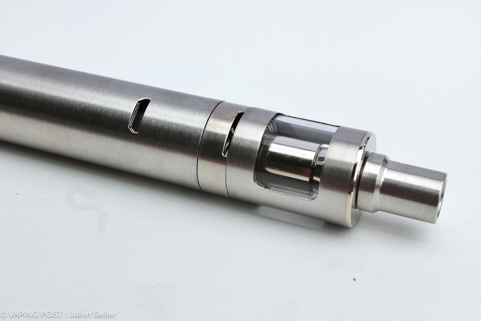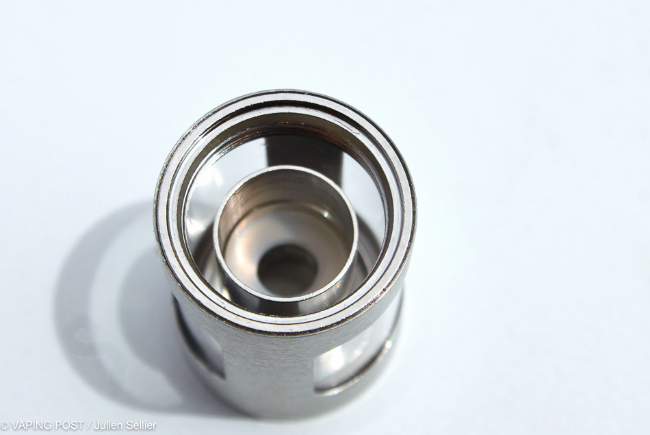 A good point for this new eGo ONE, the clearomizer possesses wider openings compared to the former version. It allows a better control on e-liquid level. Its tank capacity has unfortunately been reduced from 2.5 to 2.0 ml to comply with the EU TPD. Filling the tank is still achieved by the bottom, it then requires unscrewing the head before starting the operation. It does not constitute an obstacle to use but filling would have been easier by the top, which becomes the norm on the market.