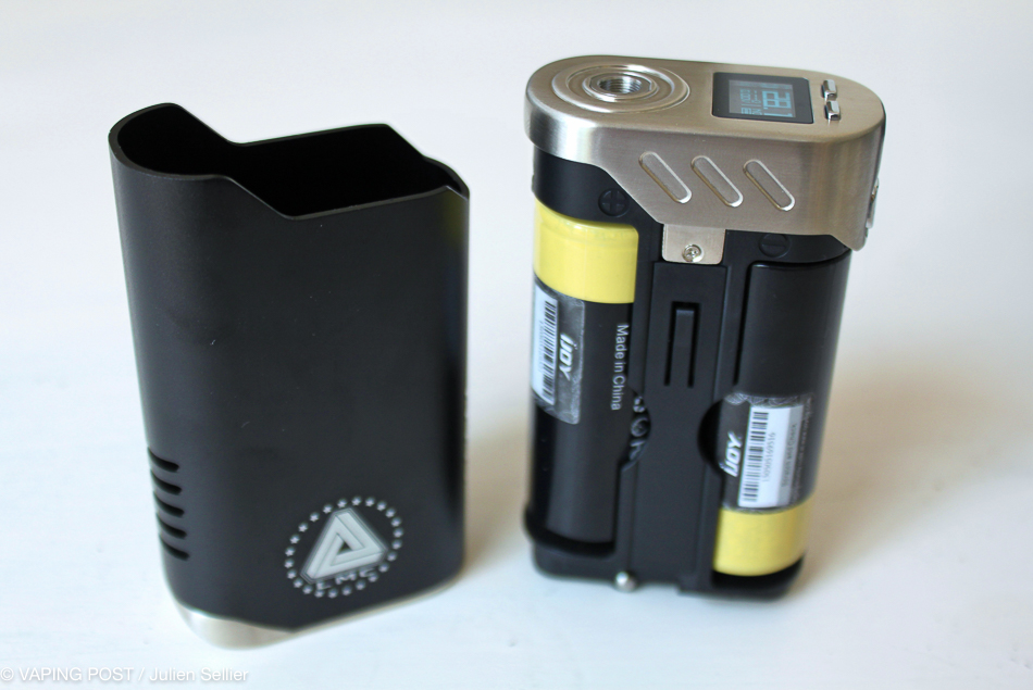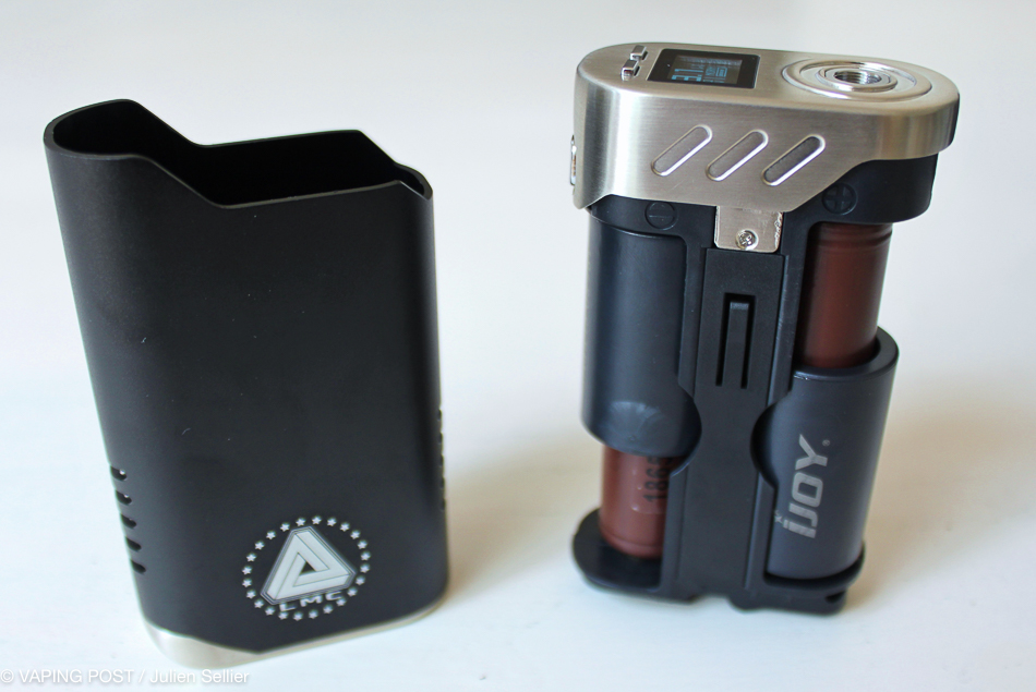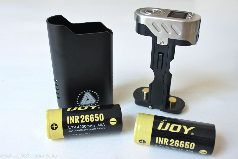 Ijoy didn’t do things by halves when including the two 26,650 batteries in the pack. They look of good quality and are sold about $20 each on the Chinese market. To gain in weight, two 18,650 batteries also fit inside with an adapter (included). Then, the weight is lowered to 283 g. To open the power compartment, you just need to slide down the shell.