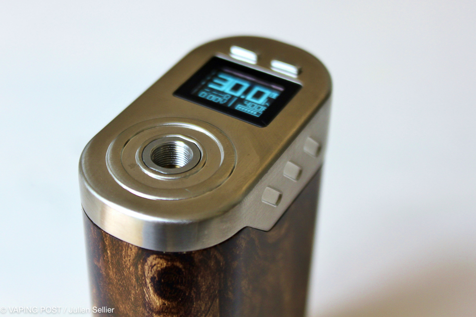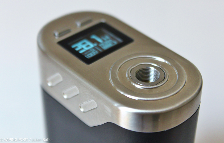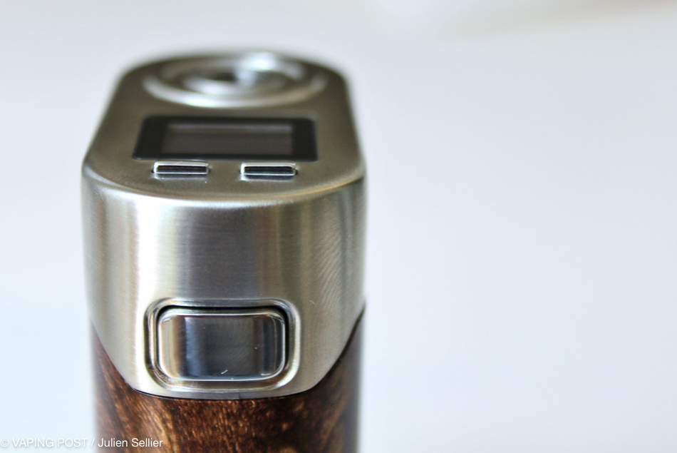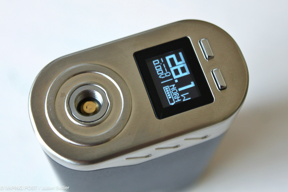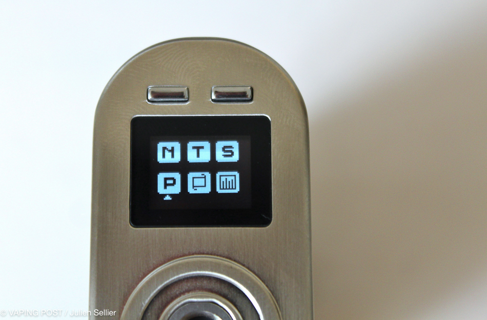 The chipset is upgradeable and intuitive. Three clics are needed to access the Menu. “N” stands for temperature control with Nichrome, “S” for SS316L and “T” for Titanium. The power mode is accessed by selecting “P”. The other icon is used to flip over the display.