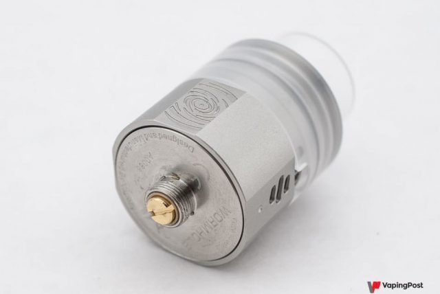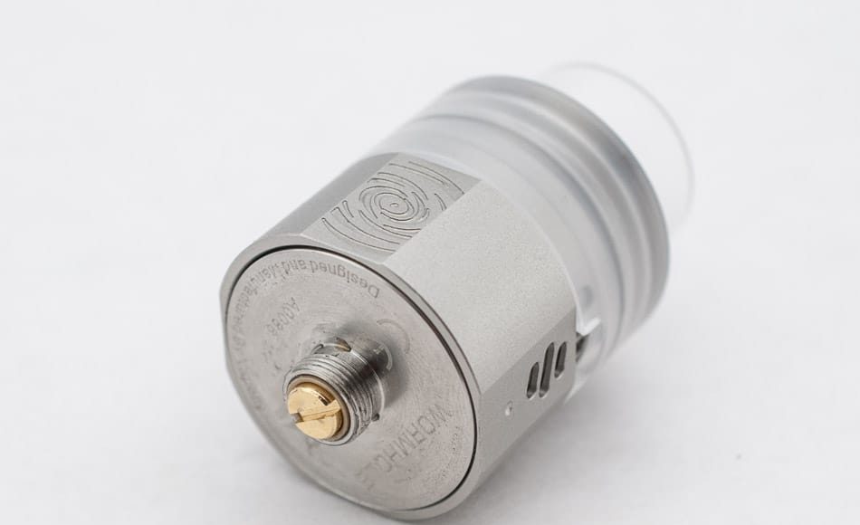 The dripper is composed of three parts: a base and a steel barrel, a plastic top cap, which accommodates a drip tip in 810 format, also frosted. Classic.