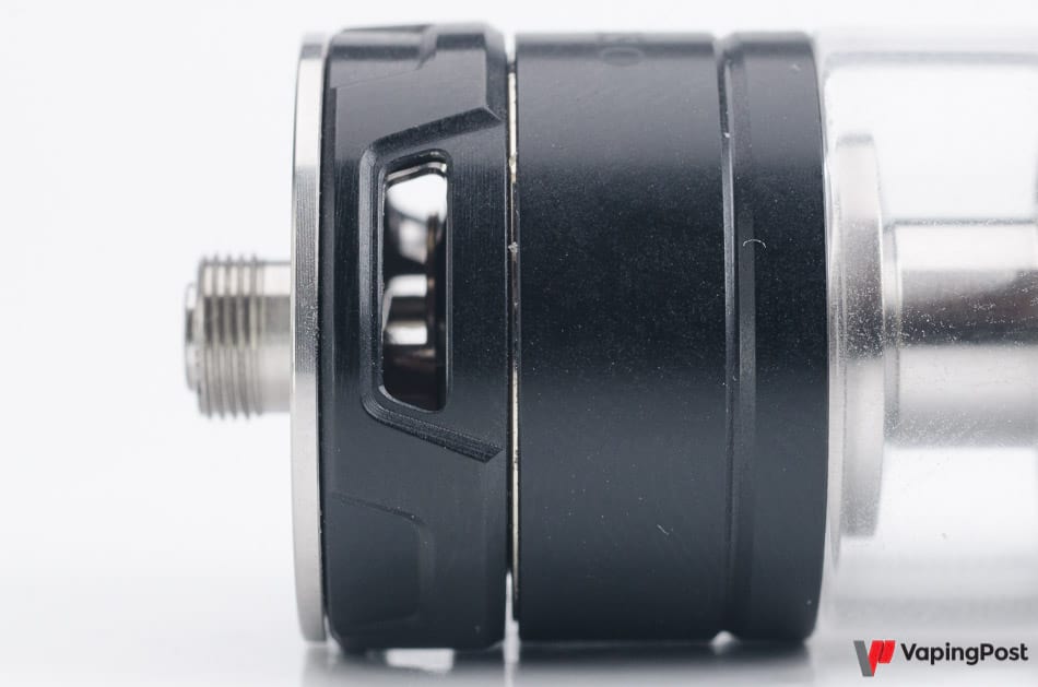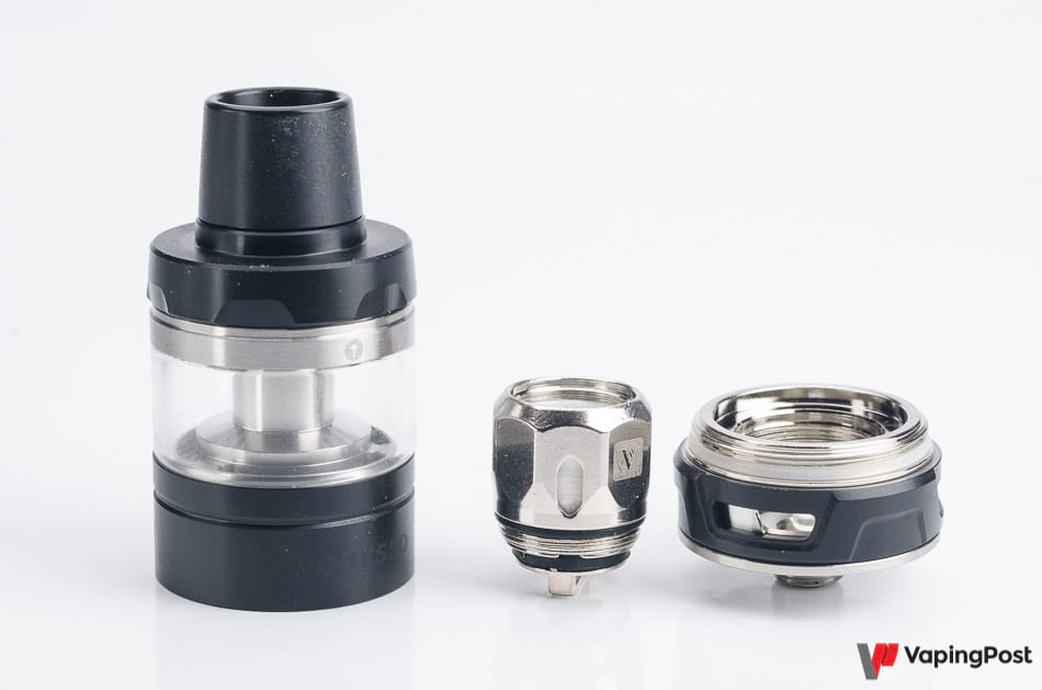 The Cascade Baby Tank clearomizer that comes with the Armour Pro in the kit is a classic subohm with two details.