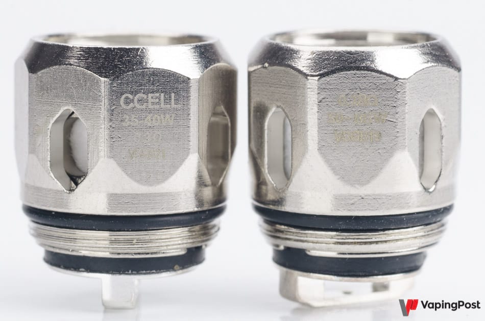 The coil heads are in mesh for the 70 W one and in single wire with a more restricted air flow for the 40 W one. The rendering of the flavours is largely one of the best in the category, and the 6 references available in the catalogue make it possible to find its vape style between 30 and 110 W, and are compatible with the resistances of Smok’s TFV8 Baby. The GT Cell 2 0,3 ohm of the kit has the particularity to use a ceramic wick.