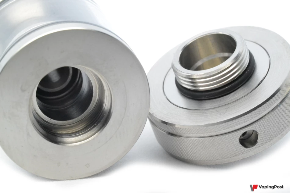 The coil is cooled via a slot on a finely knurled ring. There are 7 holes of varying diameters in all, so you can switch from a restricted direct vape to a very tight indirect vape. The three biggest holes are suitable for DL and the others are better for a less airy vape. The adjustment ring is smooth to turn – it’s not too loose and not too tight.