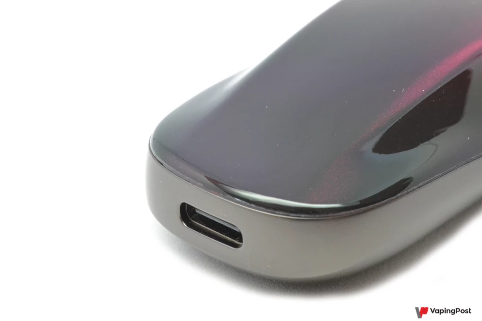 This model is all about simplicity. There are no settings to adjust and no fire button, just some LEDs set into the colourful panel to show the battery level. This is clearly visible and shows you the remaining battery life at a glance. Its 800 mAh battery puts the Zero 2 at about average compared to the competition. The USB-C connector under the edge lets you recharge the pod quickly, and the LEDs light up while charging. You can also vape while it charges.