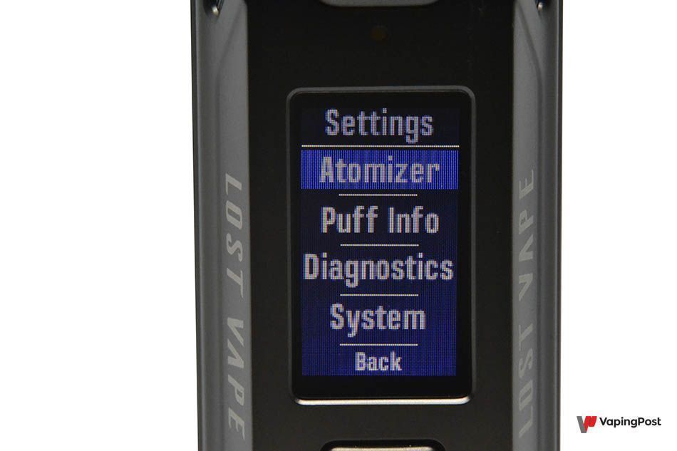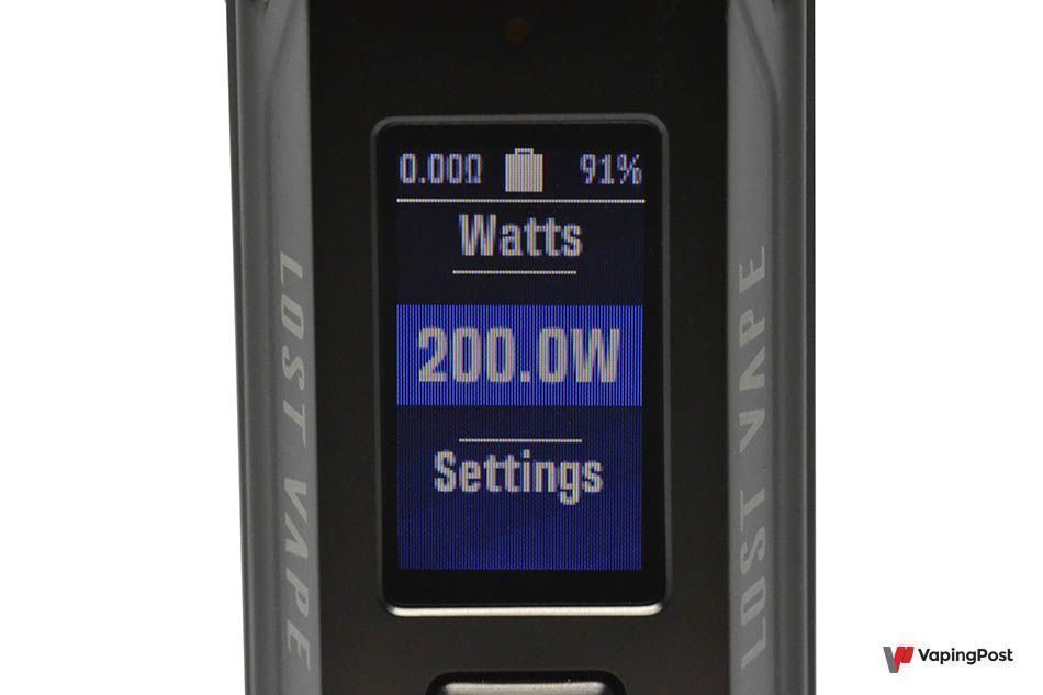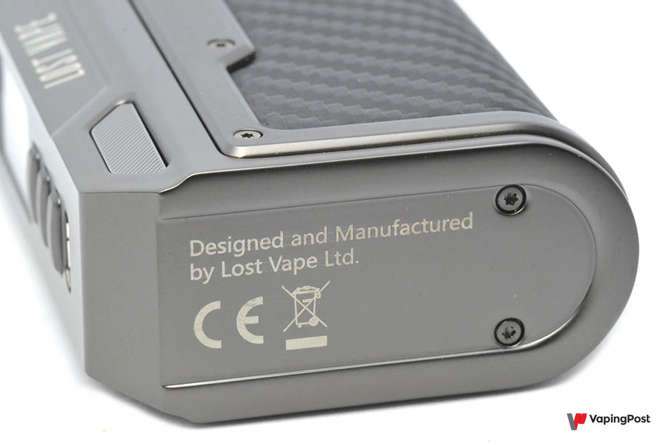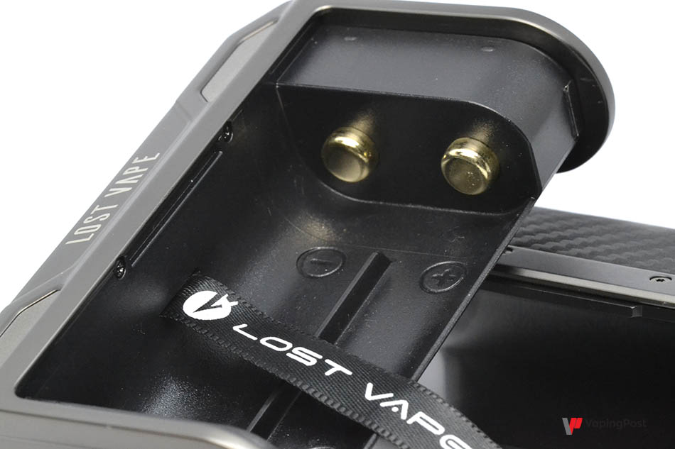 The battery compartment takes two 18650 batteries. The polarity is clearly marked, and in case of error, the box is protected against pole reversal. A ribbon with the Lost Vape name facilitates removal of the batteries. The contacts are spring-mounted and it’s really easy to fit the batteries. This is the improvement the Thelema DNA250C has in comparison to the Centaurus. The hinged flap is gone and instead we have a wide opening that makes it easy to insert the batteries. The decorated door removes completely.