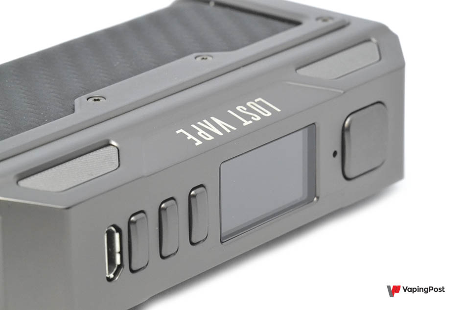 On the side of the Thelema DNA250C is the fire button (square with rounded corners), a colour LED screen, the settings and validation buttons and a micro-USB port. The buttons are soft to the touch. They don’t need to be pressed very hard and make a very slight click when they are pressed. There’s nothing to criticise. Like the whole box, they are impeccable and blend in perfectly.