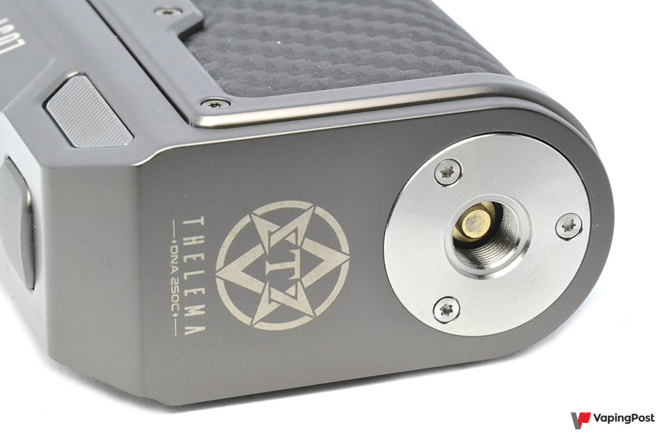 The top of the Thelema DNA250C features the logo of the model, its name and the chipset. The 510 connector is spring-loaded. It is surrounded by a plate which slightly raises the atomizer mounted on top by 0.4mm. This stops the top part of the box from getting scratched when the atomizer is changed. Nevertheless, unless you inspect the box with a magnifying glass, you can’t see any gap between the mod and the atomizer. The Thelema DNA250 is slightly reminiscent of the Centaurus DNA250C from the same manufacturer that we tested a few months ago. It is visually very similar, but little details have been added to make this mod even more desirable.