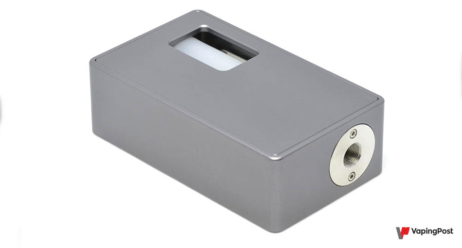 Behind this door, the brand and the logo of the mod is marked and there is a rectangular hole that will be perfect to simply push the battery out when changing it. No need for a ribbon to pull the battery out. Simply pushing it from the back is enough.