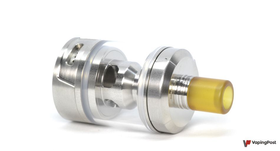 On the top, a 510 drip tip (mouthpiece) is inserted into the clearomizer. It can be removed and changed for a standard model. The top cap turns through a half turn to remove it and reveal two filling holes protected by a strip of silicon to avoid leaks.