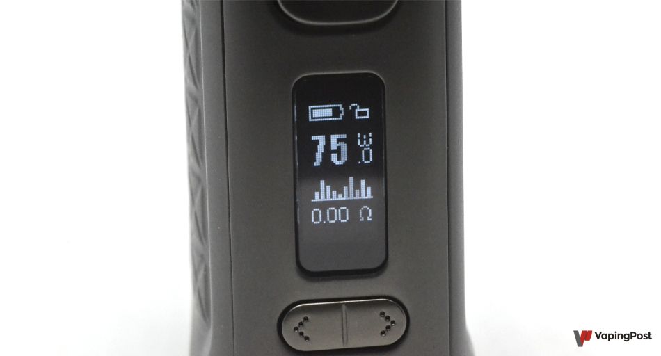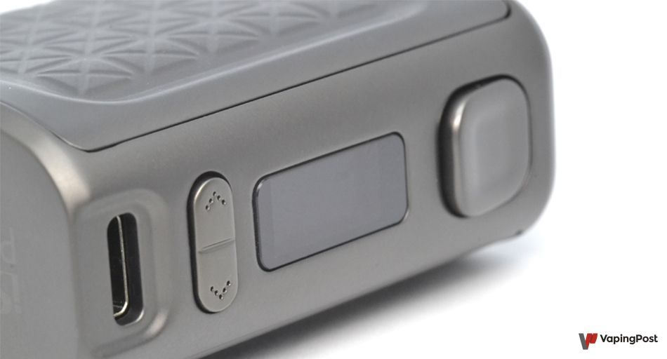 The front of the box has a large fire button, a monochrome screen giving the key information (battery level, power, resistance value) without any unnecessary frills. Below it are two buttons used to adjust the settings, and lastly a USB-C port for fast charging or to update the electronics. It should be noted that the fire button makes quite a loud click, which might be annoying.