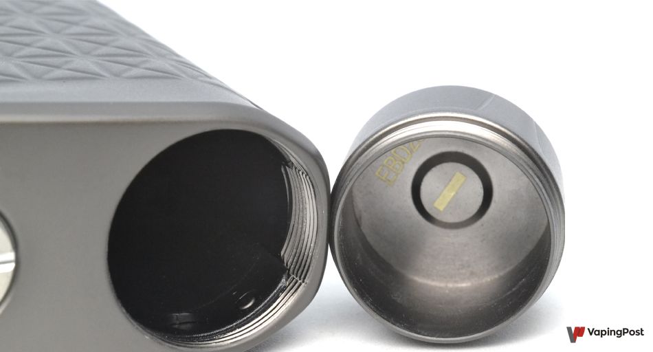The iStick Pico 2 has kept the well-known shape of its big sister with the battery cap on the top. The top does indeed have this cap that screws off to access the 18650 battery compartment. The battery orientation is clearly marked with a “-” symbol on the cap and a “+” symbol inside. Next to it is a 510 connector firmly attached to the iStick Pico 2.
