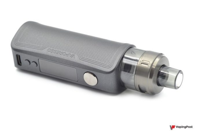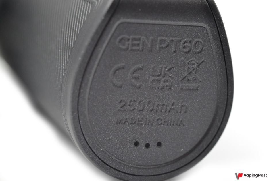 There are a few degassing holes under the pod. This is a safety feature supplementing the built-in protection systems in case of problems with the battery. The battery life is also indicated, here 2500 mAh, a value consistent with the size of the pod, but which does not mean there is no need to think about the possibility of having to charge your Gen PT60 if you use it exclusively with the 0.2 ohm coil. The coating on the battery body is slightly grooved, sufficiently low-key not to be uncomfortable to hold but enough to give a good grip.