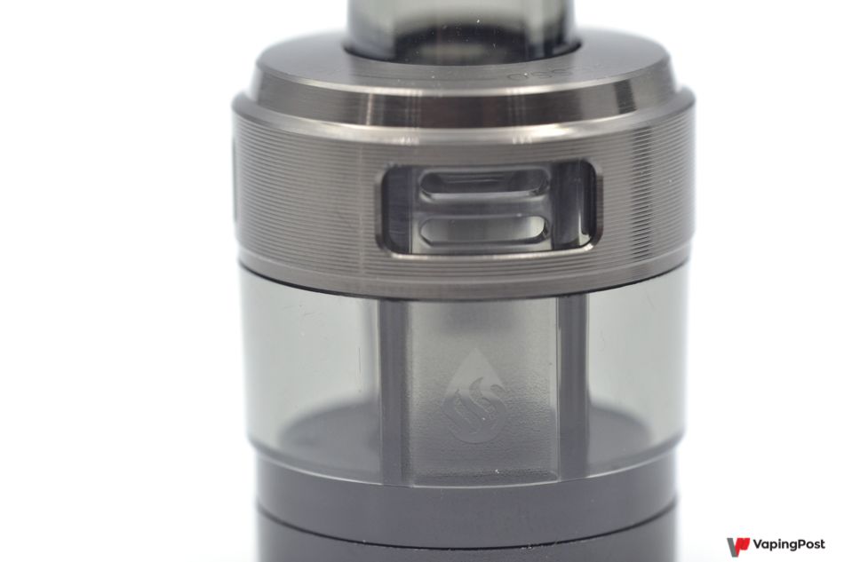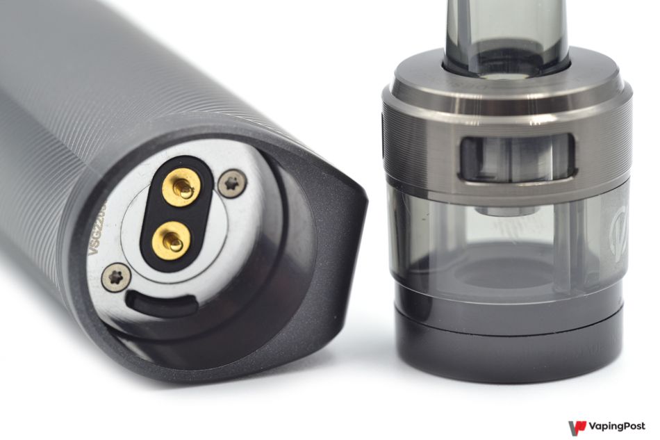 The tank is fitted onto the upper part of the battery. A small silicon extension at the base of the connector locks the cartridge in its ideal position. The hold is great and we did not notice any lateral play between the tank and the battery.