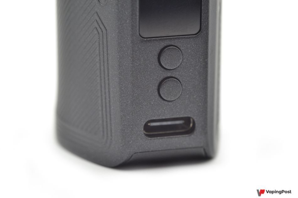 A fire button on the front generates the electric signal for vapour production. The monochrome screen just below displays the different modes. Two small settings button are used to adjust the settings. The front also has a USB-C port for fast charging or to update the electronics. Everything is well-integrated and there are no annoying clicks.