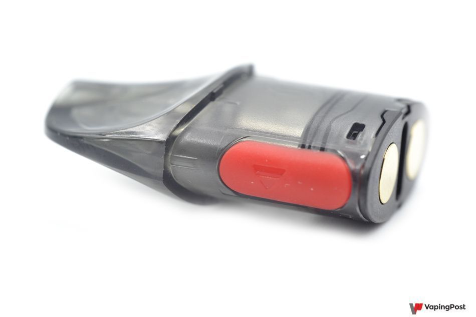 The tank fits on top of the battery. It is held in place by magnets which work perfectly. During our tests there was no noticeable lateral play or weak magnetism. The cartridge is transparent and tinted. The level of the remaining e-liquid is easy to see. However, for greater accuracy, when the tank starts to get empty, you need to remove the cartridge to avoid getting a dry hit.