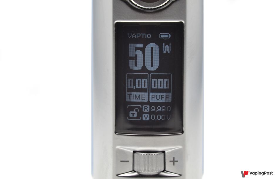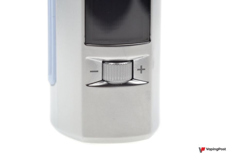 On the edge of the box there’s a monochrome screen, the fire button and a dial to change the settings. Knurling around the fire button adds to the overall design of the box. The finish is totally flawless. Whether you press it with your thumb or index finger, the fire button is easily to activate and doesn’t make any annoying noises.
