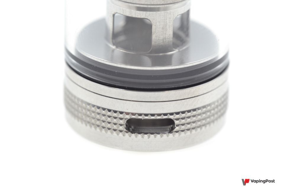 To adjust the air flow that cools the coil, just turn the ring on the base of the clearomizer. You can choose between a wide opening for direct vaping up to 35 W, or use a few holes for a much tighter vape that’s like MTL. You’d have to reduce the air intake massively if you want a restricted draw. The kit is better suited to a DL vape, where it comes into its own.