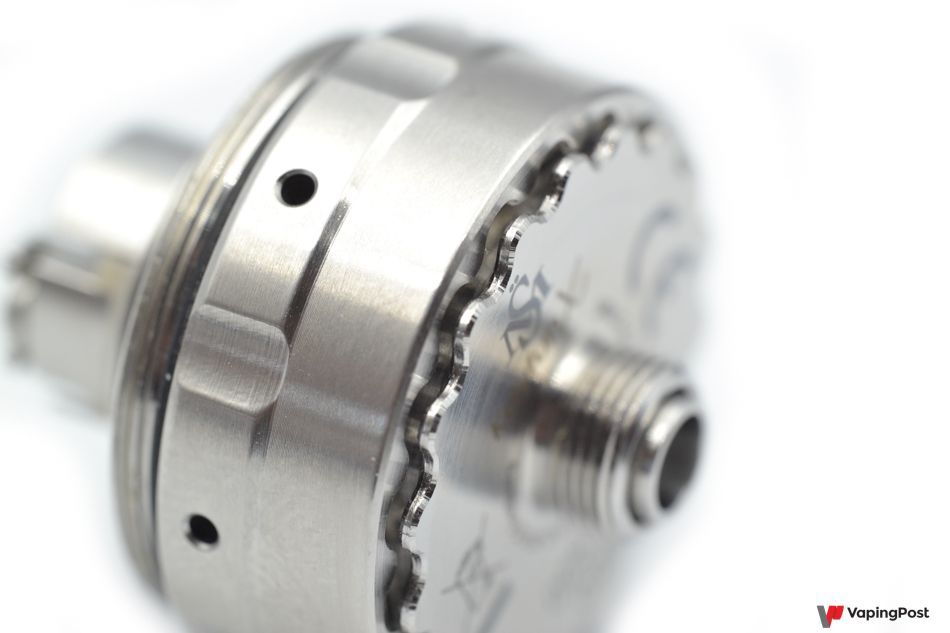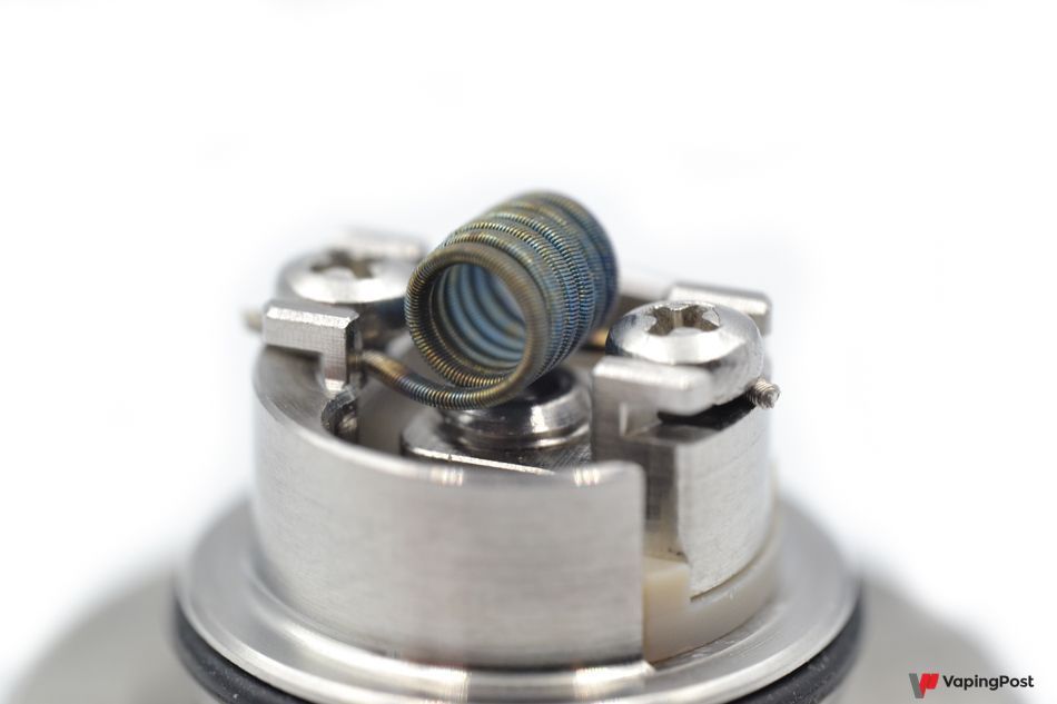The deck is a classic Kayfun deck. Two posts opposite each other to position your coil just above the air inlet. Fitting the resistance coil is easy. Two small lugs hold the coil legs in their respective slots to avoid any slippage. During our tests, we opted for an Ni80 Fused with a diameter of 2.5 mm for a stabilised value of 0.72ohm. Placing the wick requires care, just like any MTL RTA.