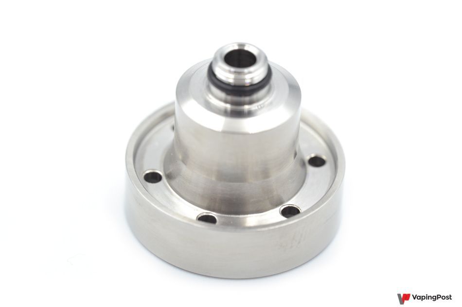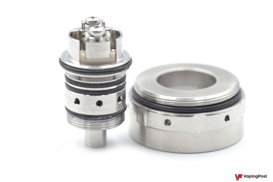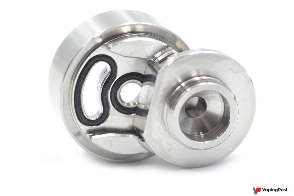 The atomization chamber is narrow and concentrates the vapour produced for better flavour rendering. It has plenty of orifices for the e-liquid to flow to the deck. The part is so accurately made that the plastic tank doesn’t need a seal between the upper and lower parts to be leak-proof.