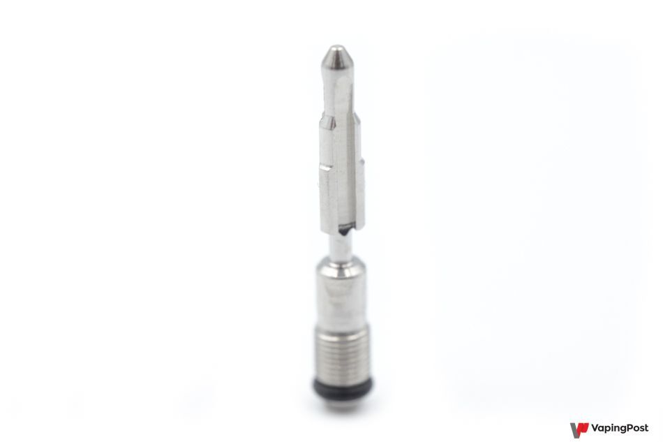 The airflow is not adjusted by inserts or holes on a ring that you turn. It is the 510 pin that acts as the airflow. The Aerokon system is simple but impressively efficient. This long screw with the stepped portions reduces the amount of air under the coil when it is screwed up. Conversely, unscrewing it allows more air in to cool the coil. The manufacturer states that the opening ranges from 0 to 1.8 mm in diameter. In actual fact, it is difficult to measure and ultimately is almost useless.