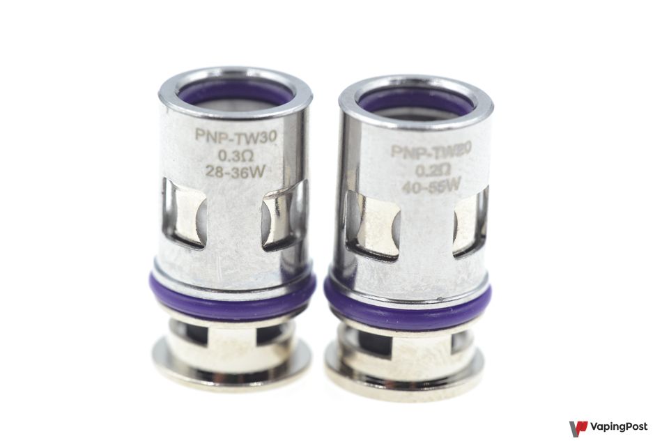The kit comes with two coils. The PnP-TW 30 can be used between 28 and 36W and the PnP-TW 20 has a usage range of 40 to 55W. All the coils in the PnP range can also be used in the PnP POD II apart from the PnP-TW 15, as its usage range is greater than the maximum power of the box.