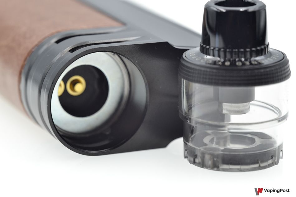 Available in six different colours, the box is made of zinc alloy, aluminium and leather. The upper part is fitted with the clearomizer. A metal ring holds the clearomizer in place thanks to three powerful magnets under the tank. The connector is proprietary. Two spring-mounted pins carry the electric current.
