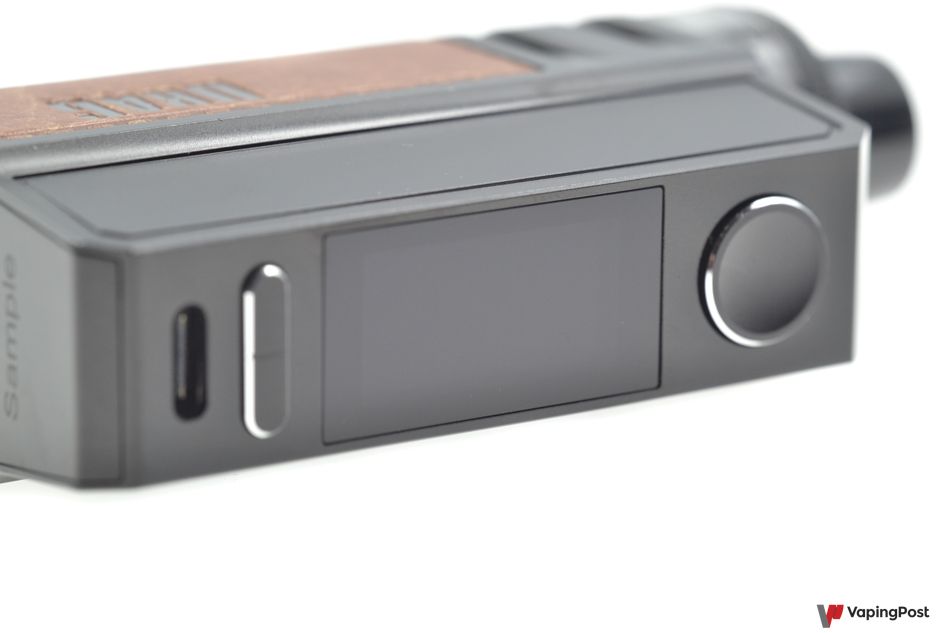 The fire button is located on the front of the box. It is embellished by a discreet silver border, and its slightly concave shape makes it particularly comfortable to use. It makes a dull click, a sign of quality. The colour screen is a TFT. It is easy to read even in direct sunlight. Unfortunately you can’t adjust the contrast. The two settings buttons are placed under the screen. A USB-C port finishes off the front of the box. It is used to charge the built-in battery (5 V 2 A maximum). The overall look is harmonious.