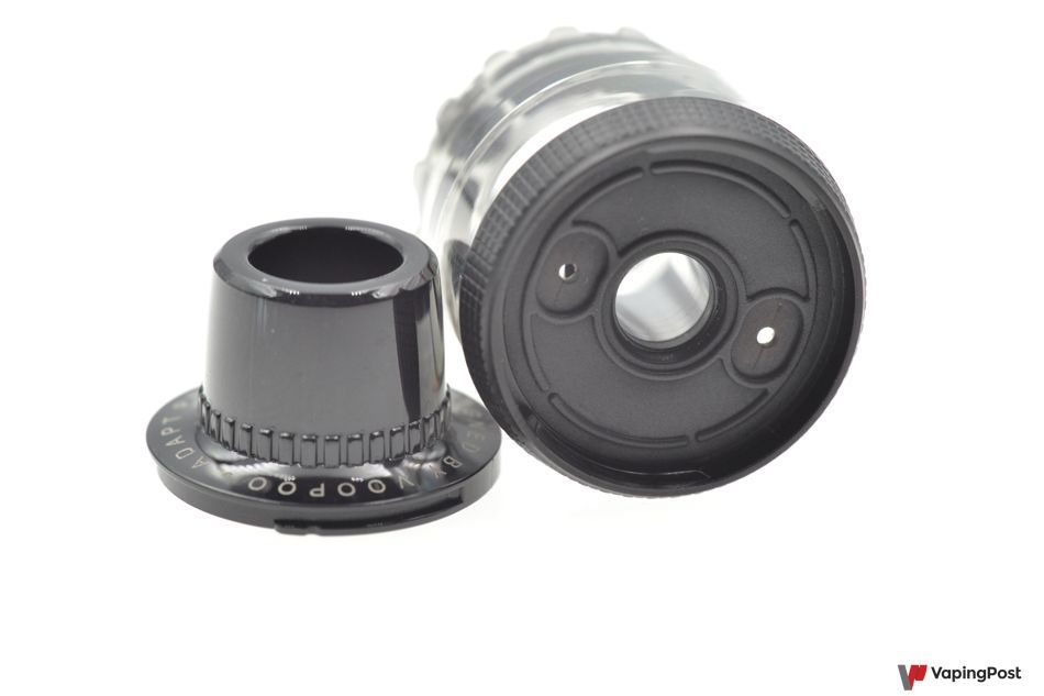 Voopoo’s new tank is made entirely of plastic and holds 4.5ml. It is held onto the box by three powerful magnets. The clearomizer is filled by the top. Simply remove the mouthpiece by turning it through 90 degrees. Once you’ve taken it off, you’ll see the two filling holes. Their small size means it’s impossible to use an e-liquid bottle with a wide tip. A wide rubber membrane ensures it is perfectly leakproof.
