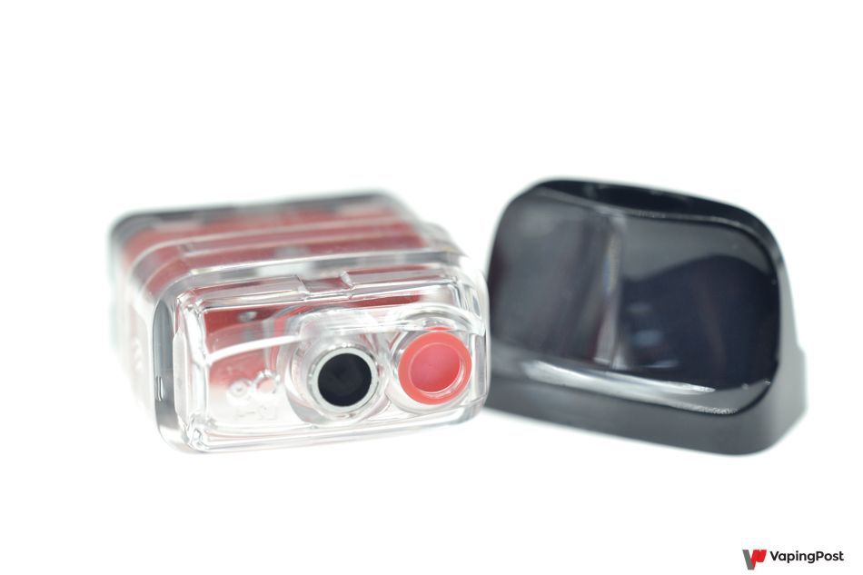 As with most pods, the cartridge sits on top of the battery. It’s held in place by two magnets that really do a great job. We didn’t notice any side-to-side play or looseness. The 2 ml tank volume is average for pods of this size on the market right now.