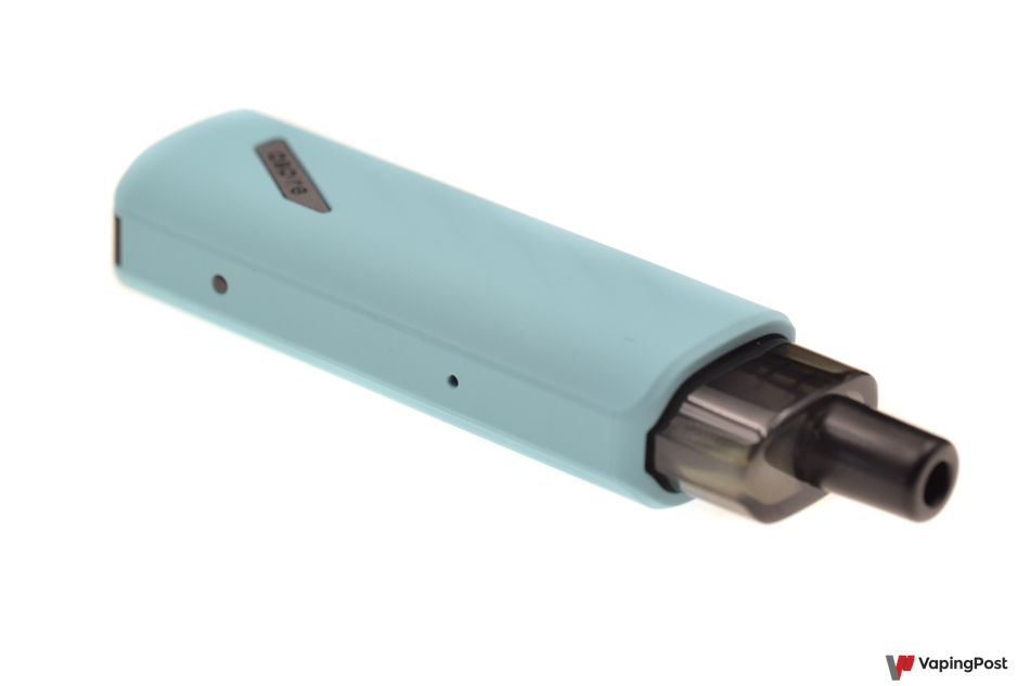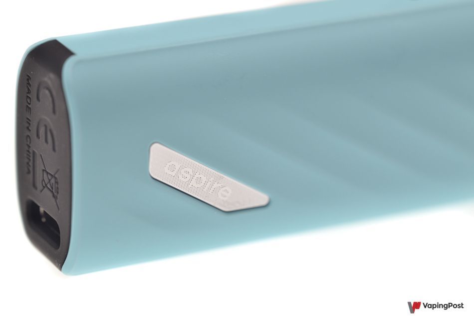 On the side, at the base of the pod, there’s a small metal plate bearing the brand’s logo. It’s discreet and flush with the surface. The battery casing is plastic with a soft touch finish and feels cushioned to the touch. The battery cover is ribbed along its whole length for a great grip.
