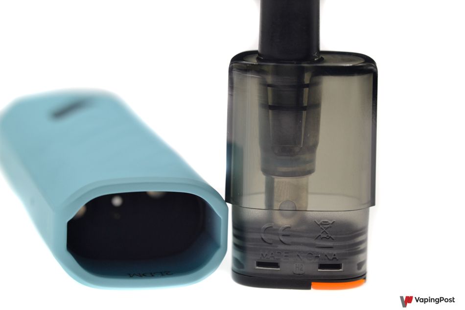 The cartridge sits on top of the battery, which is standard for a pod. It’s held in place by two powerful magnets which make sure it stays firmly in place. There is no sideways play around the tank, so nothing to complain about here. The cartridge contains a sealed coil. You can’t change the coil without replacing the whole tank. It’s easy to do, so there are no fiddly coil changes here. Unfortunately, it does mean there’s a lot of plastic involved.