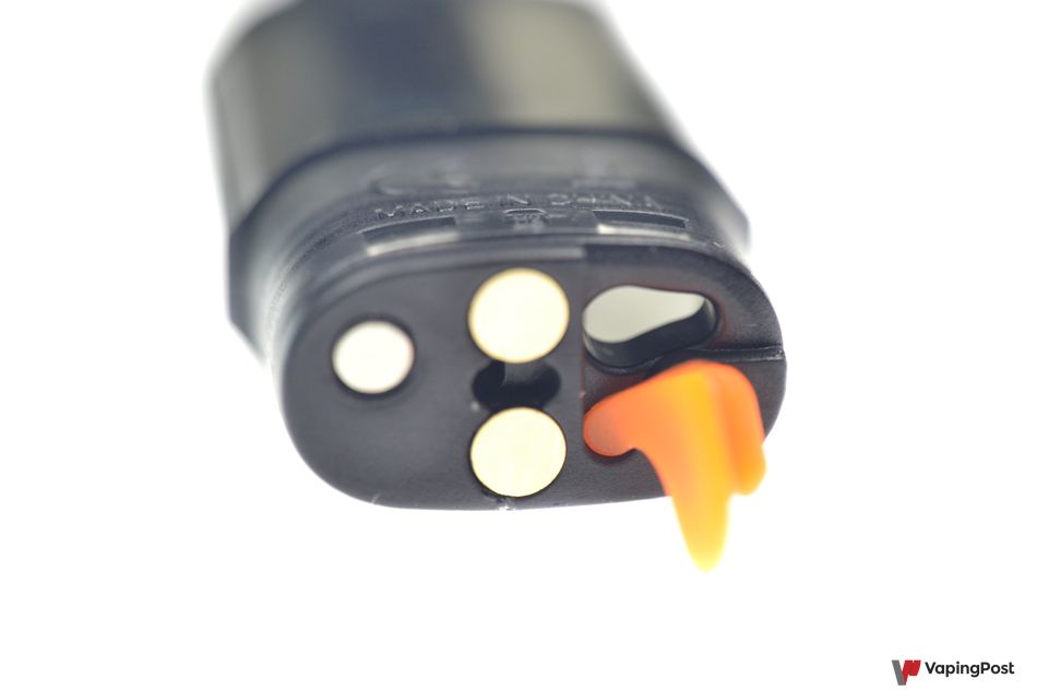 There’s a hole on either side on the upper part of the battery to cool the coil inside the cartridge. The size of the holes is perfect for creating a tight, indirect inhalation draw (into your mouth then into your lungs, like a tobacco cigarette).