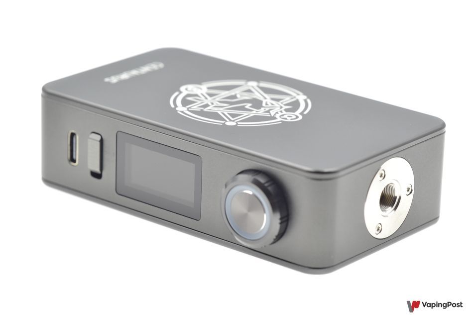 On the upper part of the front there’s a large rotary fire button that lights up. Underneath it is the control screen, where you adjust all the settings for the box. The electronics are easy to use and practical. We will come back to that later. The front also has the on/off switch and a USB-C port for recharging when needed.