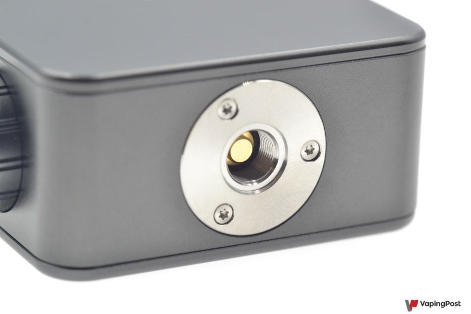 The Centaurus M200 is made of anodised aluminium. It comes in 7 colours. The 510 connector is top and centre. It’s made of stainless steel and stands very slightly proud of the body of the box to prevent it getting scratched. The positive pin is spring-mounted. The M200 can take atomizers with a diameter of up to 26 mm without any overhang.