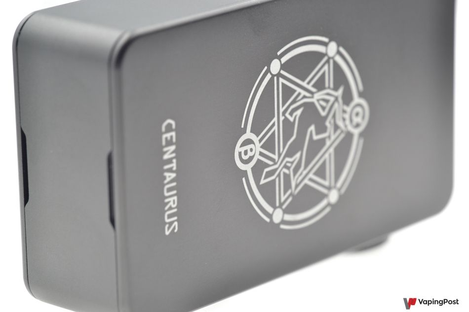 There’s a panel on each side of the Centaurus M200. These are held in place by strong magnets. There is very slight side-to-side play, but this is barely noticeable and is not a problem during use. Two notches in the body of the box allow you to take these panels off. You can swap them if you want to. One of them has a striking engraving of the zodiac sign of Sagittarius in the centre and the name of the box at the bottom.