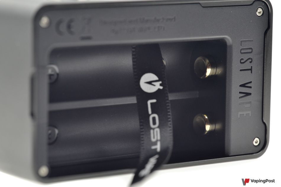Inside, the battery compartment holds 2 x 18650 batteries. The upper contacts are spring-mounted. The battery direction is clearly marked. The chipset has built-in reverse polarity protection. The name of the manufacturer and the usual pictograms are also etched into it. There’s a fabric tab with the Lost Vape logo on it to help remove the batteries.