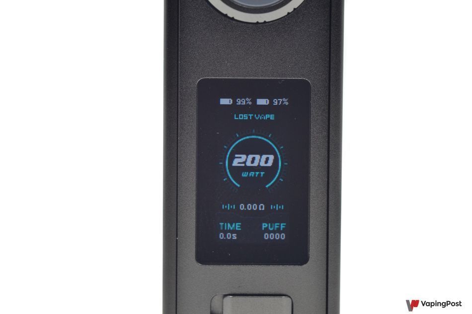 Unsurprisingly, Lost Vape has brought back its Quest 2.0 chipset, but this version is ultra streamlined. The Centaurus M200 only has power mode, and there are two different displays: standard mode (blue display) and DIY mode (red display). Both of these show essential information about the device: the battery charge level (as a visual and as a percentage), the power setting, coil value, fire time and a puff counter.