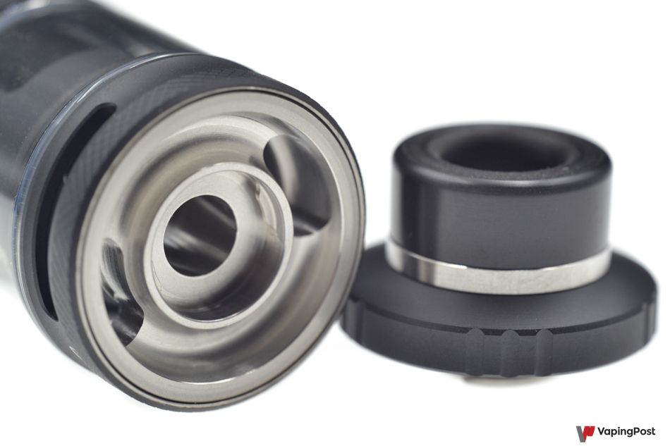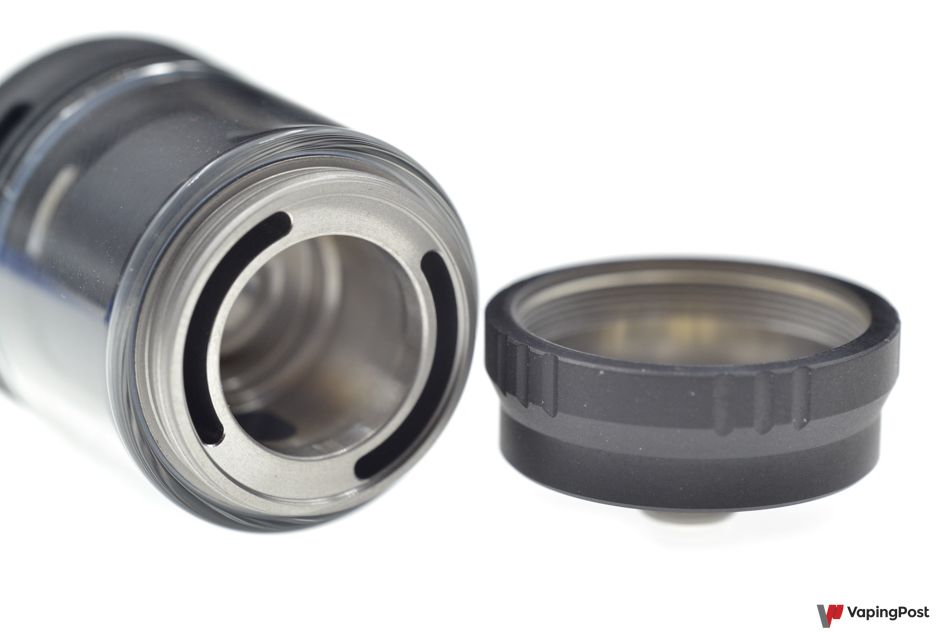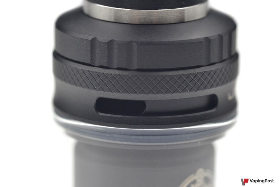 The air inlets are positioned on both sides of the clearomizer, but above the tank to prevent leaks. Adjusting the air intake is easy, thanks to the easy-to-grip knurled ring. The openings are long and wide, which makes the Centaurus Sub Ohm Tank airy. It also delivers great flavours.