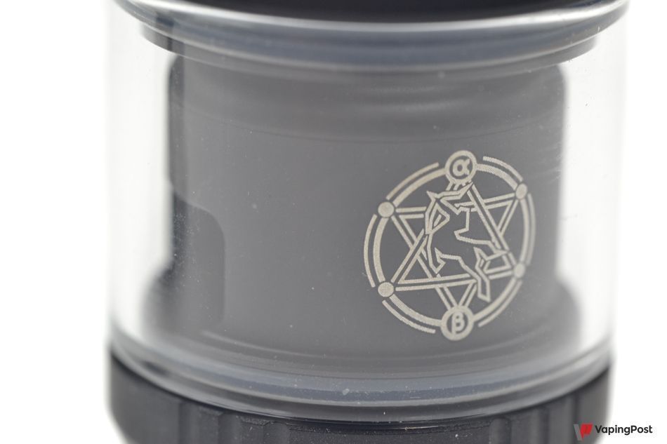 The inside of the clearomizer tank is decorated with a delicate engraving. It shows a Centaur with his bow. The machining is neat and the details are clear.