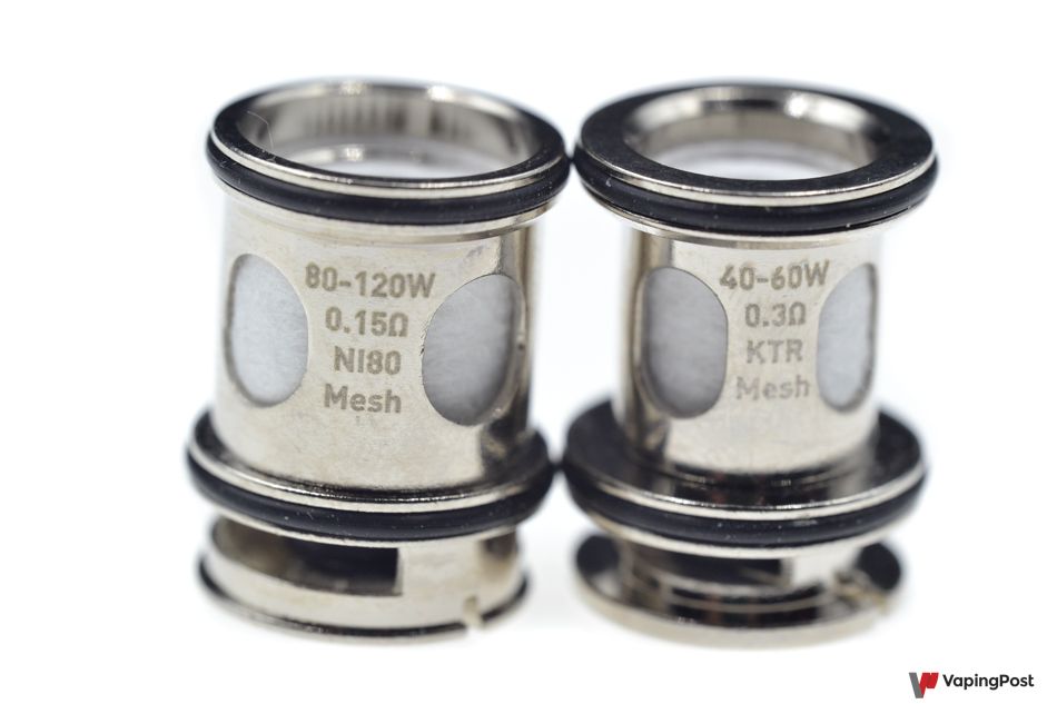 Two coils are supplied in the box. One is a 0.15 ohm Ni80 mesh for a range of use from 80 to 120 W, and the other is a 0.30 ohm Khantal mesh for use between 40 and 60 W. Both coils work very well. The volume of vapour it makes with the 0.15 ohm coil is impressive. But a double battery box will be more useful if you want to use such high power levels. It produces dense, flavourful vapour.