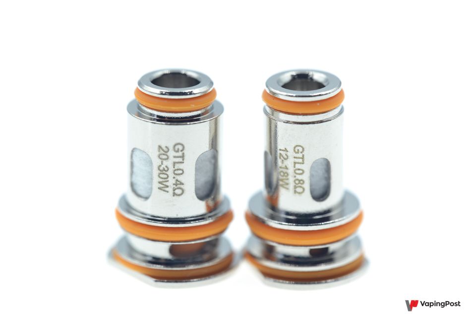 Two coils are supplied in the box. The 0.4 ohm GTL is best suited for restricted direct inhalation and requires a power level of 20-30 W. The GTL 0.8 ohm is designed for indirect inhalation and only needs 12 to 18 W. Flavours are well-rendered and it works better with fruity flavours. The vapour is cold or just lukewarm depending on how you adjust the airflow ring.