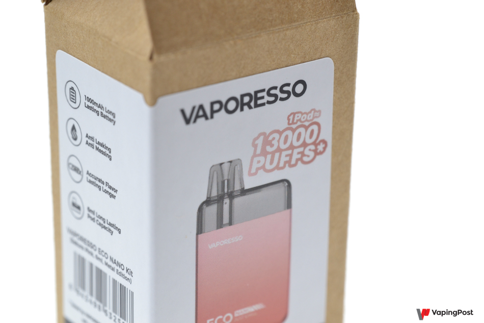 Although the Eco Nano uses cartridges with sealed coils, i.e. disposables, we still want to congratulate Vaporesso for choosing to use 100% cardboard packaging. This reduces the amount of plastic involved, after all. The box is marked with the number puffs you will get out of the pod. The Eco Nano box says it’ll give 13,000 puffs. It’s hard to say how accurate this statement really is because it depends on how each user inhales and what liquid they use.