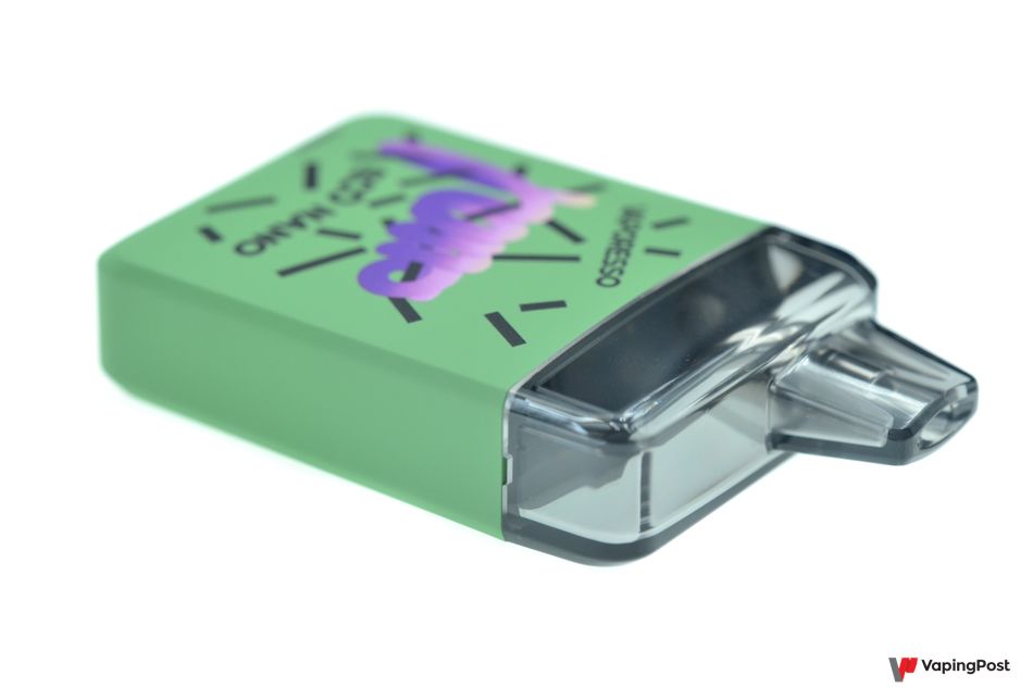 The cartridge contains a 0.8 ohm mesh coil. You fill the tank by lifting the silicone tab. The opening is pretty wide, so you’ll be able to use most e-liquid bottle tips.