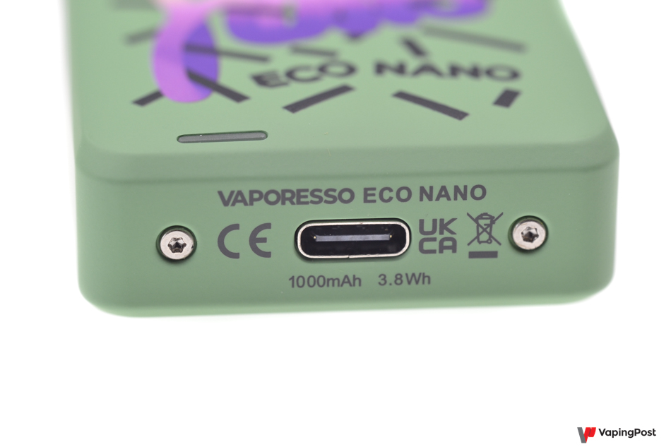 A USB-C port on the bottom of the Eco Nano allows fast charging of the built-in 1000 mAh battery. The battery life is good for the size of the pod. You can also vape while it’s charging.