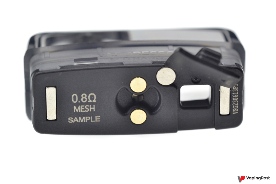 The disposable cartridge holds 6 ml. This puts the Eco Nano at the top of the pod rankings in terms of e-liquid capacity. The cartridge is sealed, so you have to throw away the entire tank when you notice it wearing out. The cartridge fits above the battery. It’s held in place by two magnets that really do a great job. There’s no play at all when you’re vaping with this pod.