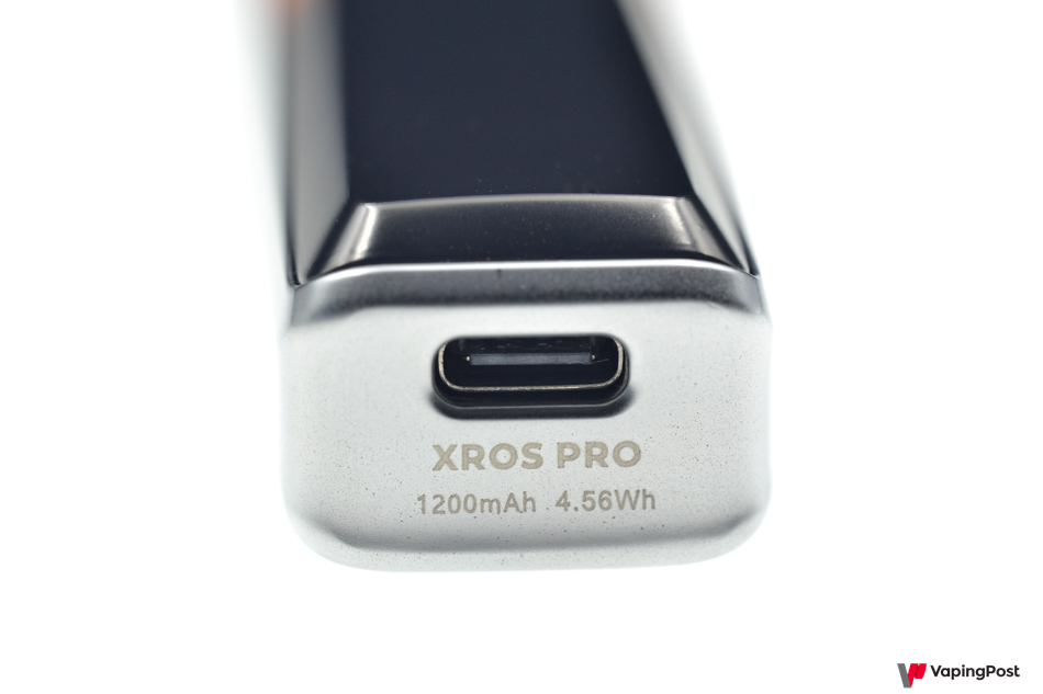 On the underside of the pod is a USB-C port for fast-charging the 1200 mAh battery. The battery is not the largest on the market, but is consistent with the coils in the cartridges. The pod charges very quickly and it can be used while it’s charging. The screen displays the time remaining before the end of charging and the battery percentage. Even though the Xros has a fire button, vapour can be produced by simply inhaling.