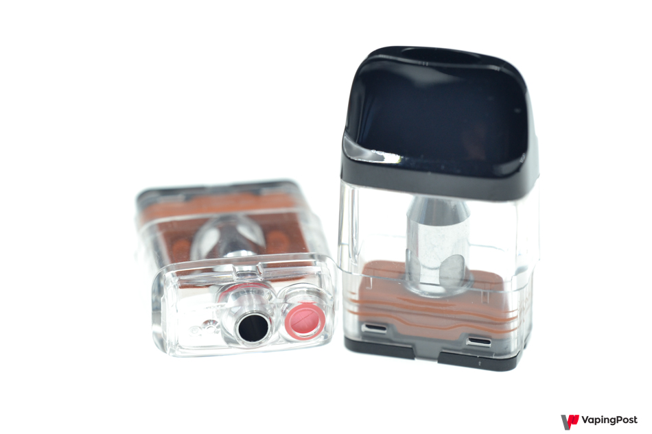 The 3 ml cartridge is fitted on the top of the Xros Pro. It is firmly held in place by a magnet. If it falls heavily, the cartridge may come off the device, but in normal use, no lateral play was noticed between the tank and the battery body.