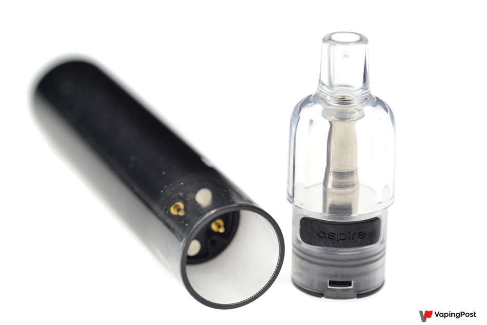 The cartridge fits on the top of the battery. Its hold is firm and there’s no play at all. The upper part of the battery body is transparent. This lets you see how much liquid is left without having to remove the tank, even though it sits quite far down inside the vape. This is a bonus as it also protects the e-liquid filling hole.